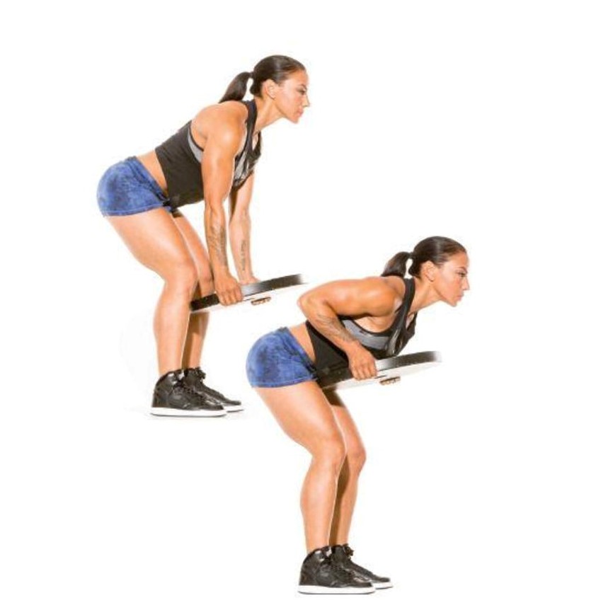 Using the same technique as the dumbbell row, start with feet shoulder – width apart, holding the medicine ball or plate in front.